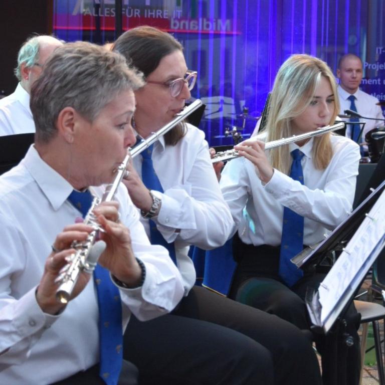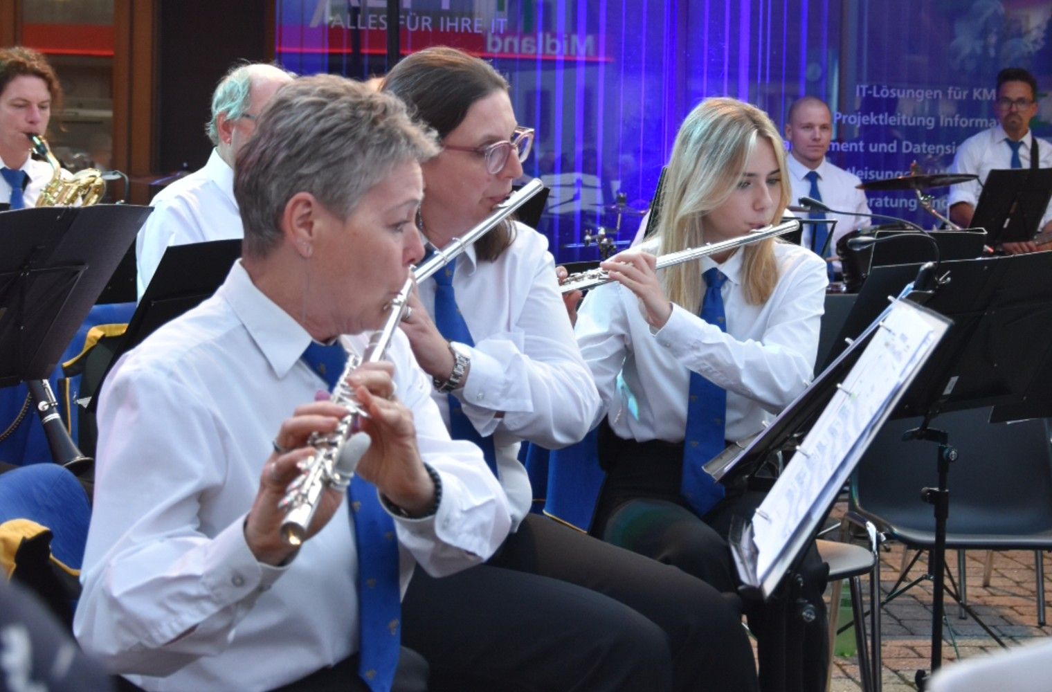 Um 18.45 Uhr trafen sich bereits einige Musikantinnen und Musikanten, um den Dorfplatz für unsere Gäste und das Musikkorps einzurichten. Für das leibliche Wohl wurde von unserem Apéro-Sponsor M+T Baldinger AG gesorgt. Langsam aber sicher füllte sich der Dorfplatz und zahlreiche Gäste aus Muhen und Umgebung warteten gespannt auf die Eröffnung des Konzerts. Um 20.00 Uhr ging es dann los: «So schön ist Blasmusik», gespielt als kurzes Intro, könnte da nicht besser passen. Mit dem Marsch «Marignan» sowie «Puttin’ on the Ritz» ging es rasant weiter. Richtige Feststimmung kam mit dem Polka «Auf der Vogelwiese» auf. Nach dem ersten Teil folgte eine rhythmische Trommeleinlage des Tambourenvereins Oberentfelden-Muhen T-O-M.